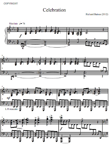 I have not until now considered publishing my piano pieces in sheet music form. However, if you wish to try a few bars, here is the first page of Celebration. A printable full size page can be downloaded here (Celebration -- download .pdf file and open). |